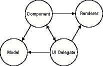 Typical Swing GUI components consist of at least three objects: a Component, a Model, and a UI Delegate. In Swing's architecture, the Model is charged with storing the data, while the UI Delegate is responsible for getting data from the Model and rendering it to the screen. The Component generally coordinates the actions of the Model and Delegate, while also acting as glue to the AWT windowing system.